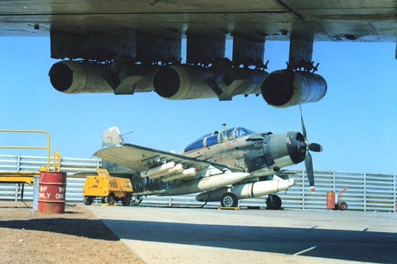A unique shot of a loaded A-1E framed by the ordnance from