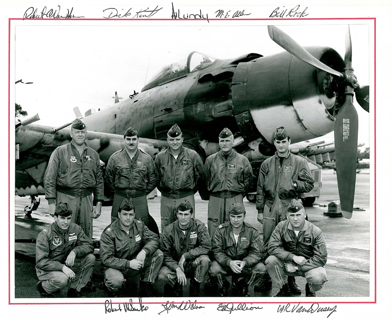 Back row: Lt Col Vanhorn, Capt Richard B. 'Dick' Kent III ( 20 04/04/22) , Maj Albro L. 'Al' Lundy Jr. ( KIA 70/12/24 ) , Maj Allen, Lt William 'Bill' Rock Front row: Lt Wilson, Capt Robert 'Bob' Senko, Lt Wade Tillery, Capt Edwin Gullion ( 2022 /07/22) , Maj Willard R. Van Dusen Jr. ( 19 79/05/25) |