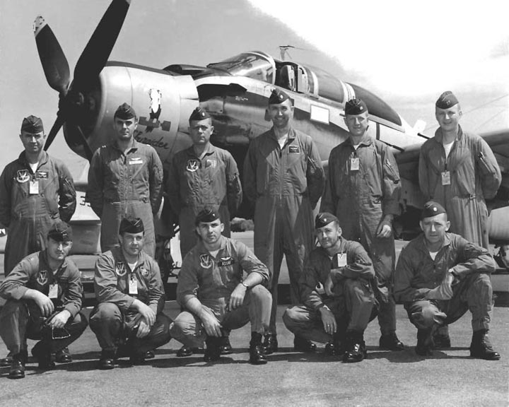 Back row: Capt A.C. 'Tony' Markl ( 2012/04/11 ) , Capt R.A. Campbell, 1Lt George E. Flynn III ( KIA 64/09/23 ) , Capt Walter L. Dixon, Capt M.C. Heath (deceased) , Capt Morgan C. Pummill Front row: Capt Clyde Evans (IP) (1993/02) , Col Heinie Aderholt (2010/05/20) , Capt Walter G. 'Thunder' Harris , Maj Eugene Lancaster, Capt William Y. 'Bill' Duggan ( KIA in F-4 , 71/12/31) NP/I: LtCol J.M. Porter, Capt B.L. Steinbach |