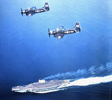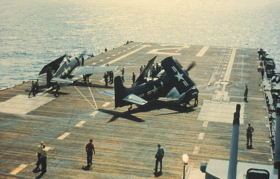 One of the most unusual missions of the Korean War was the use of F6F Hellcat drones from GMU-90 loaded with 1,000 pound bombs. The F6Fs had remote controls and television guidance cameras, which were controlled by VC-35 AD-4D drone controllers. One AD-4D controlled the F6F on the deck and during launch. The second waited until the F6F was airborn before taking over control.