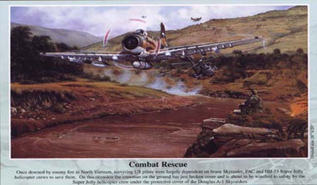 Once downed by enemy fire in North Vietnam, surviving US pilots were largely dependent on brave Skyraider, FAC and HH-53 Super Jolly helicopter crews to save them. Missions like this one in North Vietnam were always very dangerous, resulting in the loss of many rescue aircraft and their courageous crews. On this occasion the crewman on the ground has just broken cover and is about to be winched to safety by the Super Jolly helicopter crew under the protective cover of the Douglas A-1 Skyraiders - otherwise known by their call sign 'Sandy.' Keeping watch above is the Bronco spotter plane that first located the pilot on the ground, and then scoured the area ensuring there was no enemy threat to the rescue team.