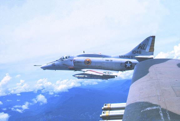 A USMC A-4 Skyhawk joins for a closer look at an Air Force Spad