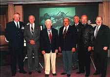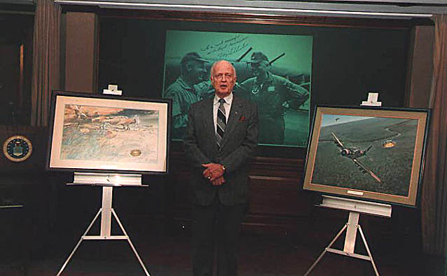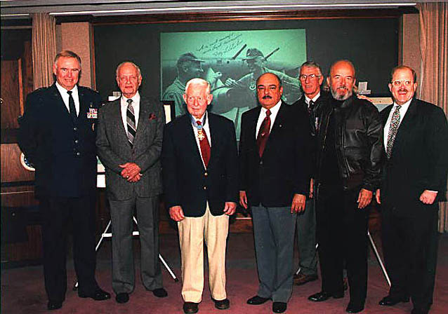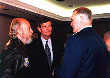 The occasion was the formal presentation by Col Bernie Fisher of copies of a new book documenting his Medal of Honor mission. The book, underwritten by Boeing, published by Stellar Productions of San Diego and is being distributed by the Air Force Association's Aerospace Education Foundation to ROTC and Junior ROTC programs. Gene brought together Bernie Fisher and three of the other 1st ACS Skyraider pilots who were there on the mission that day--M/Gen Denny Hague, Col John 'Luke' Lucas, and LtCol Paco Vasquez. The ceremony also included Richard and Stella Torres, the publishers from San Diego