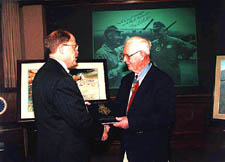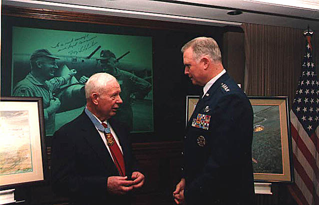 | Medal of Honor recipient Colonel Bernard Fisher (USAF, Ret.) and USAF Chief of Staff General Mike Ryan share a moment during a ceremony which took place at the Pentagon on 9 Mar 99. |